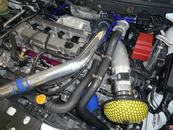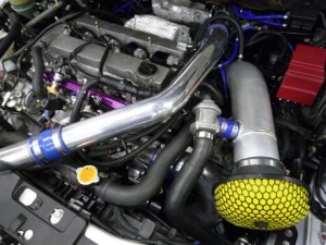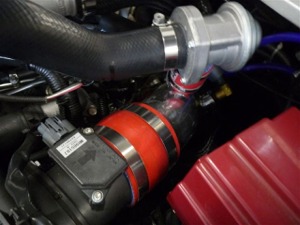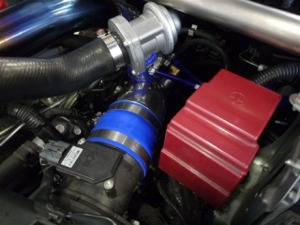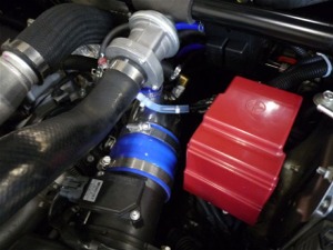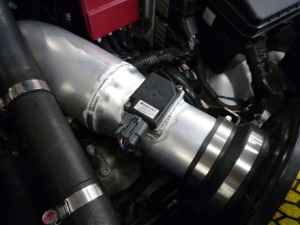 に拡大したエアフロパイプは、インタークーラーパイピングに押し込み式する予定でしたが、 実際にセッティングすて見ると、とても無理でした。 昔のRB26やSR20等のエアフロと違い、単なる空気量の測定だけでなく、ブースト圧も多少感知してしまうので エアフロ電圧が脈動しまくりで燃調が落ち着きませんでした。 その為、エアフロはサクションに吸い込み式にして設置してセッティングをやり直す事になりました。 でもそれだけでは一筋縄では行かない感じです・・・もう少しお待ち下さい。 |